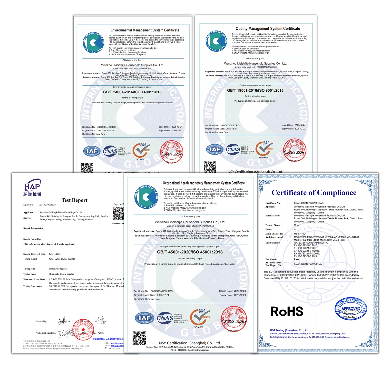 Мы имеем широкий спектр сертификатов, включая CE, ISO 9001, ISO 14001, ISO 45001, RoHS и REACH, что гарантирует соответствие нашей продукции самым высоким международным стандартам качества, безопасности и защиты окружающей среды.